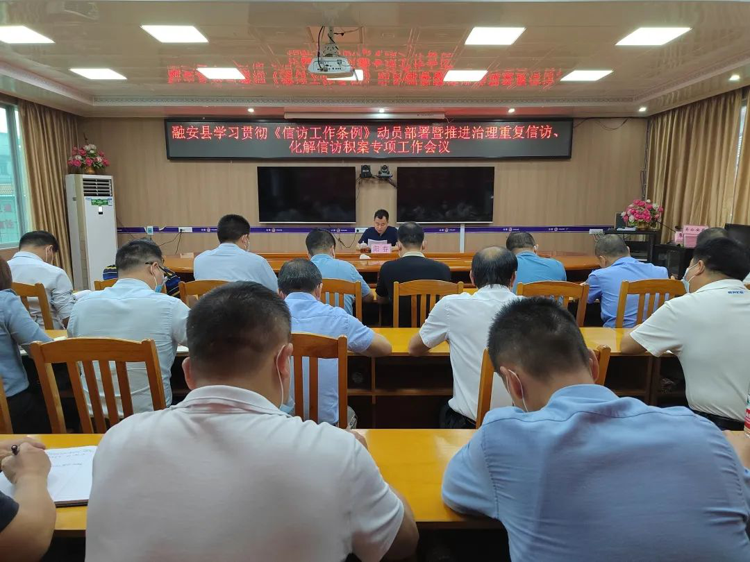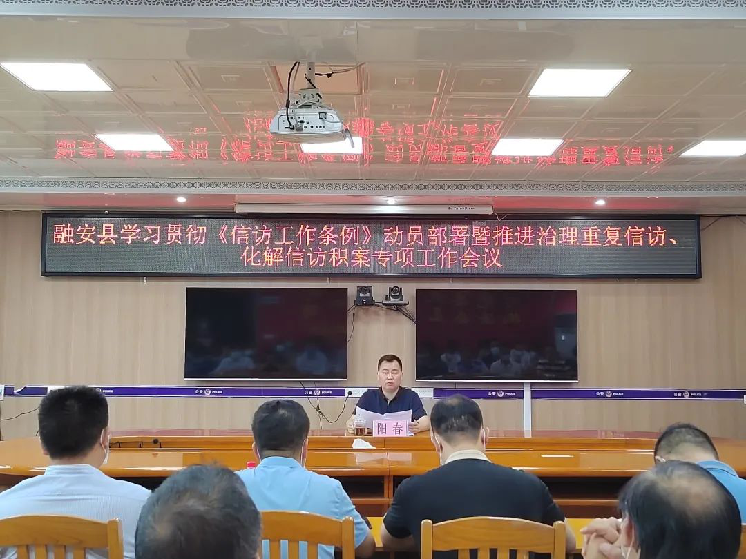 4月26日,融安县召开《信访工作条例》动员部署暨推进治理重复信访、化解信访积案专项工作会议,对学习贯彻中共中央、国务院最新印发的《信访工作条例》进行了动员部署,对我县1-4月治理重复信访、化解信访积案工作推进情况进行通报并提出下一步工作要求。县委常委、政法委书记阳春参加会议并讲话。