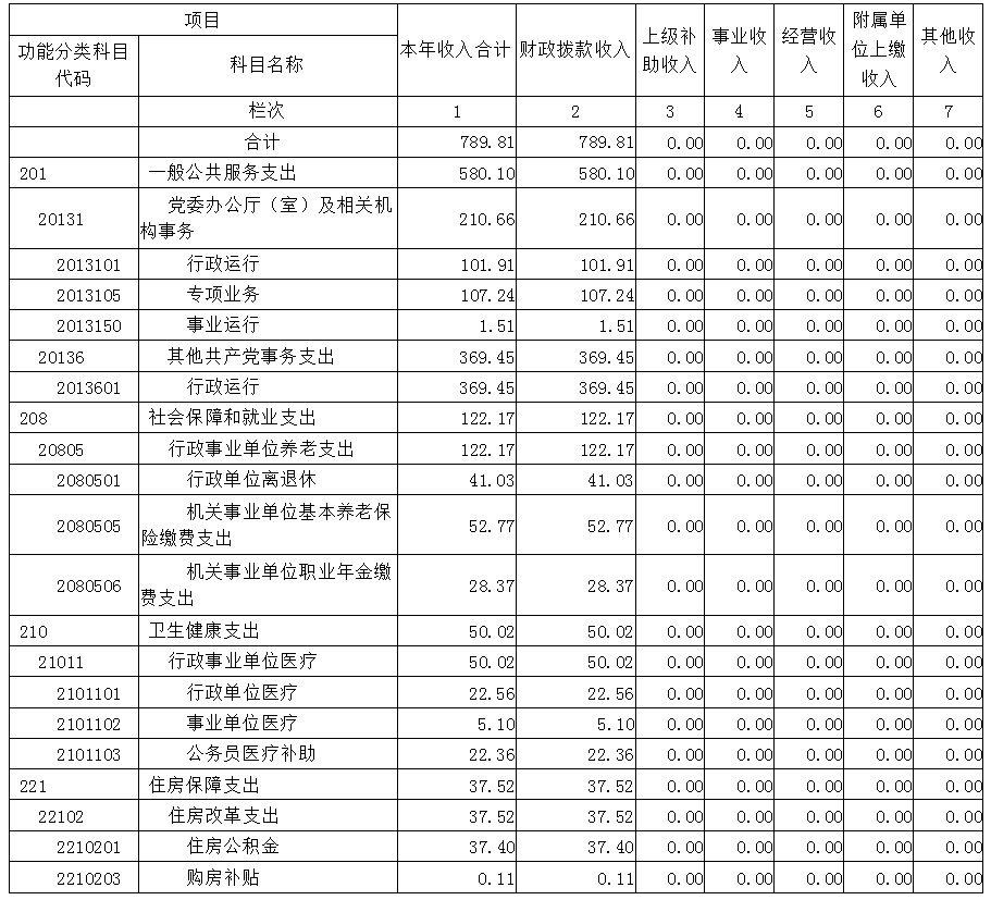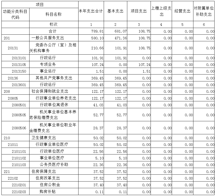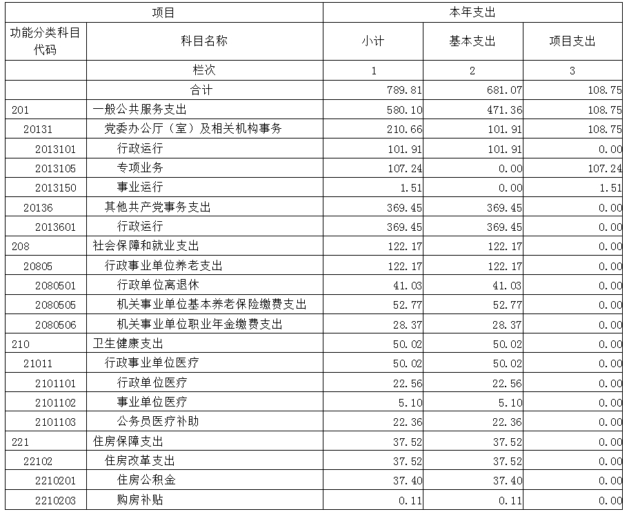 (二)本部门2023年度总支出789.81万元,其中本年支出 789.81万元,较2022年度决算数增加49.07万元,增长6.62%。支 出具体情况如下: