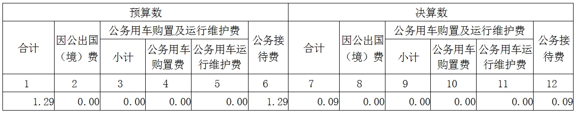 本部门2023年度财政拨款安排的“三公”经费支出预算为 1.29万元,支出决算为0.09万元, 比预算减少1.20万元,低于预 算的主要原因是:按照过紧日子的要求,增加线上视频会议,减 少公务接待费和会议费支出。较2022年决算数减少0.40万元,下 降81.63%,主要原因是:按照过紧日子的要求,增加线上视频会 议,减少公务接待费和会议费支出。其中: 因公出国(境)费支 出决算为0万元;公务用车购置及运行维护费支出决算为0万元; 公务接待费支出决算为0.09万元。
