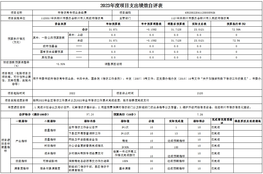 市信访局专项业务经费项目自评综述:全年预算数31.71万 元,执行数23.01万元,执行率为72.56%, 自评得分为97.26分。 项目绩效目标总体完成情况良好,完成预期设定的绩效目标。发 现的主要问题及原因:在执行中存在业务水平不足,预算编制细 化度不够的问题。主要原因是因为工作人员学习培训预算绩效管 理工作不够深入,知识层面不够宽广,预算评价的制度不够健 全。下一步改进措施:加强评价小组成员的培训学习,增强评价 管理体系,细化预算编制,加强财务管理,严格财务审核。