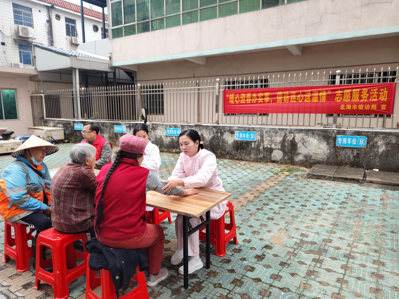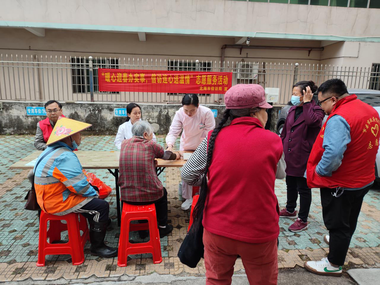 活动现场暖意融融,志愿者们兵分三路,精准聚焦群众需求,把贴心服务送到家门口。在“健康同行”义诊服务点位,医务人员为居民免费测量血压,耐心解答常见病防治、春季养生等健康咨询,用专业的讲解为居民的健康保驾护航;在小区的公共区域、卫生死角和绿化带,志愿者们手持清洁工具认真开展“净美家园”环境清扫,让小区环境在新春前焕新颜,同步宣传垃圾分类知识和北海市文明城市建设基本知识,提高居民的环保意识与文明素养,助力文明城市建设走深走实;针对小区内行动不便的孤寡老人,志愿者们开展“墨香送福”上门服务,将饱含美好祝福的春联福字亲手送到他们手中,与居民亲切交谈,传递节日的问候与关怀。