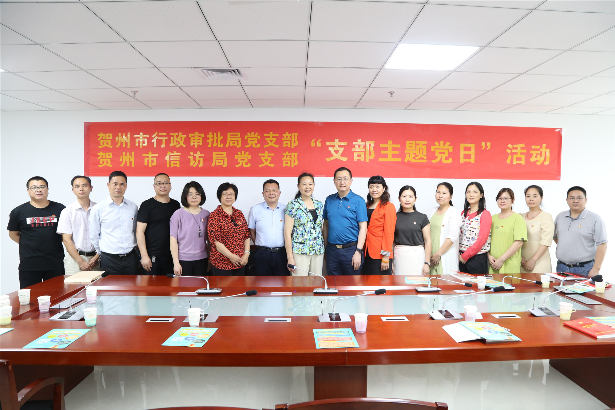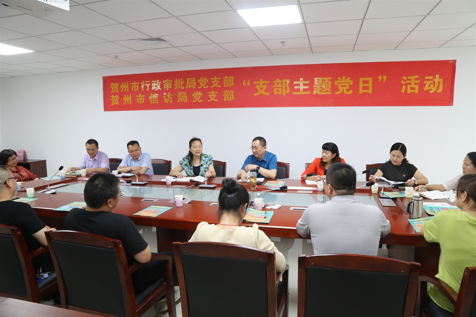 2019年4月29日,贺州市信访局党支部组织党员干部到市行政审批局,与该局党支部联合开展以“便捷、高效、服务、为民”为主题的支部主题党日活动,并一起进行了座谈。