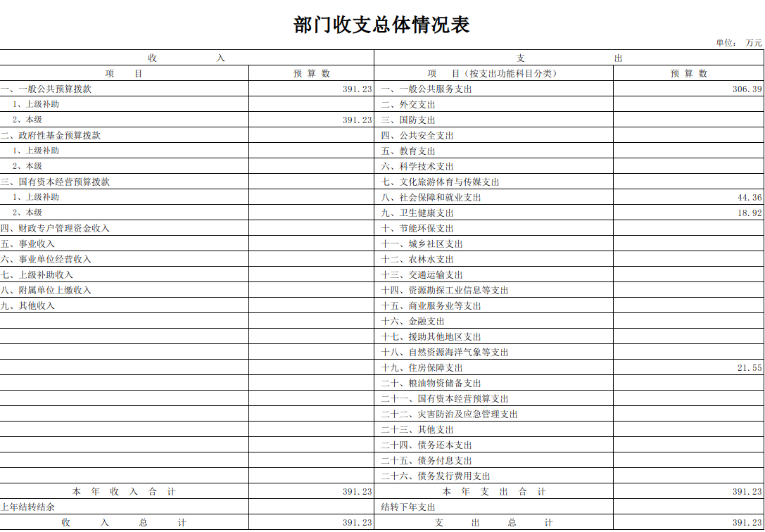 2022年部门预算总收入391.23万元,同比(增加)13.44万元,(增长)3.56%,其中: