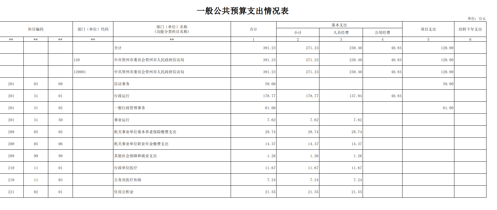 (一)贺州市信访局。行政编制11人,聘用人员控制数0人,财政供给单位编制内实有人员17人,其中行政编制在职人员11人,离退休人员6人(其中享受离休待遇0人)。编外在职实有人数0人。