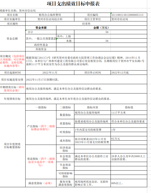 4.租用办公场所费用项目56万元。主要用于租用市广兴景园小区1117平方米办公场所费用56万元,保证市信访局、市联席办正常办公。