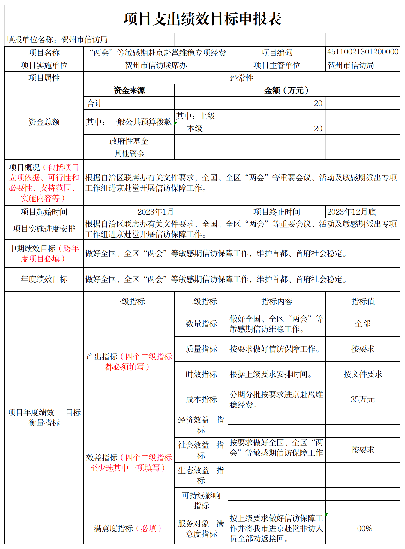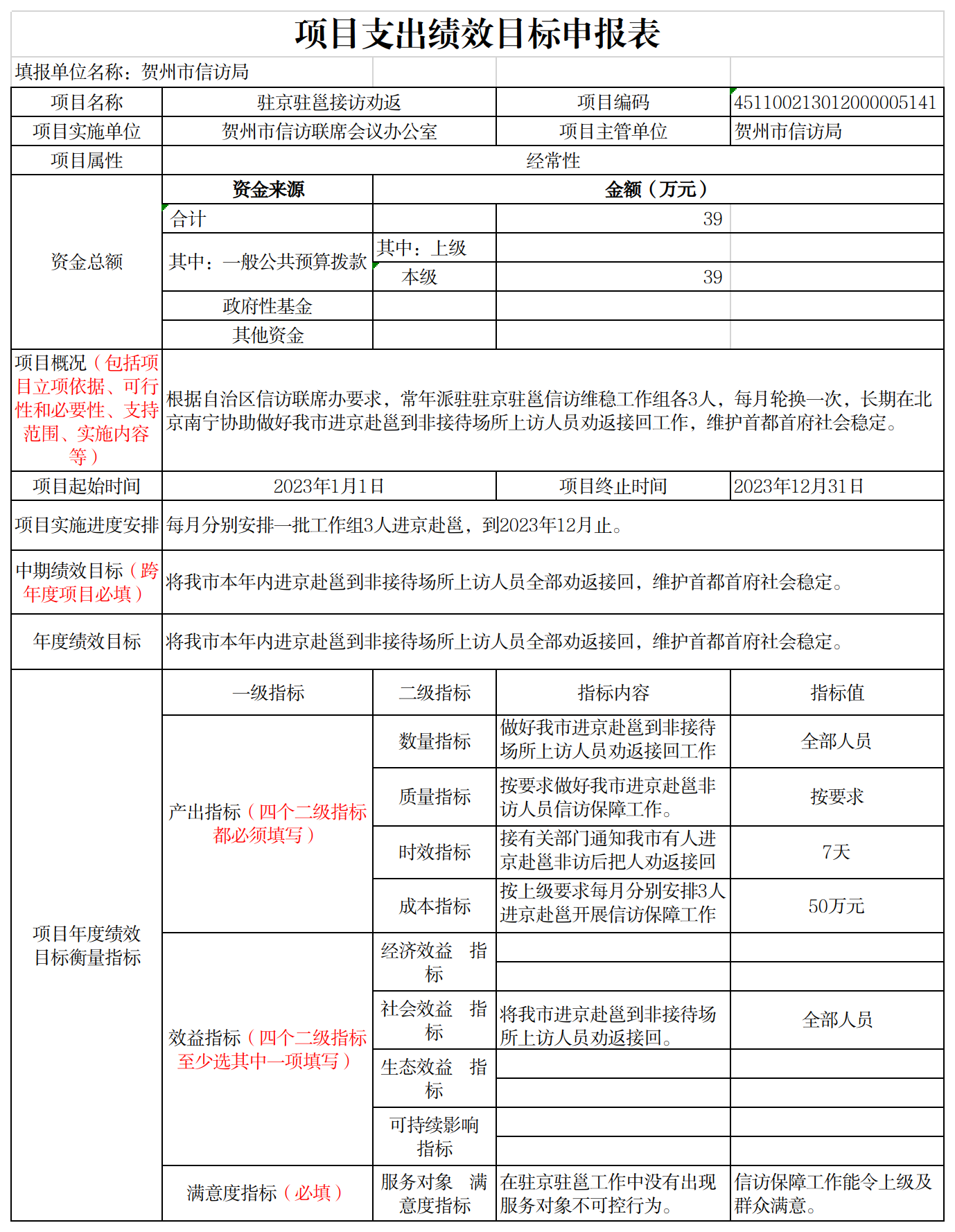 2023年,市信访局实行绩效目标管理的项目4个,涉及公共财政预算拨款120万元;纳入部门预算绩效评价试点的项目4个,涉及公共财政预算拨120万元。其中驻京驻邕接访劝返项目,项目资金39万元。一级指标:1.产出指标:①数量指标:数量指标做好我市进京赴邕到非接待场所上访人员劝返接回工作。②质量指标:按要求做好我市进京赴邕非访人员信访保障工作。③时效指标:接有关部门通知我市有人进京赴邕非访后把人劝返接回。④成本指标:按上级要求每月分别安排3人进京赴邕开展信访保障工作,指标值为50万元。2.效益指标:社会效益为将我市进京赴邕到非接待场所上访人员劝返接回。3.满意度指标:服务对象满意度指标为在驻京驻邕工作中没有出现服务对象不可控行为,信访保障工作能令上级及群众满意。